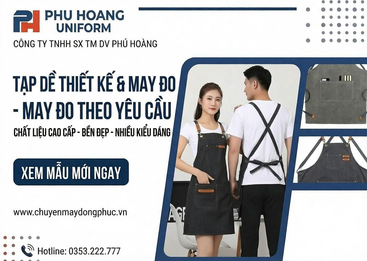 Dịch vụ may tạp dề theo yêu cầu số lượng lớn. Đa dạng chất liệu từ Jean, Canvas đến Kaki. Phú Hoàng hỗ trợ in thêu logo sắc nét, giúp định vị thương hiệu hiệu quả cho các chuỗi F&B.